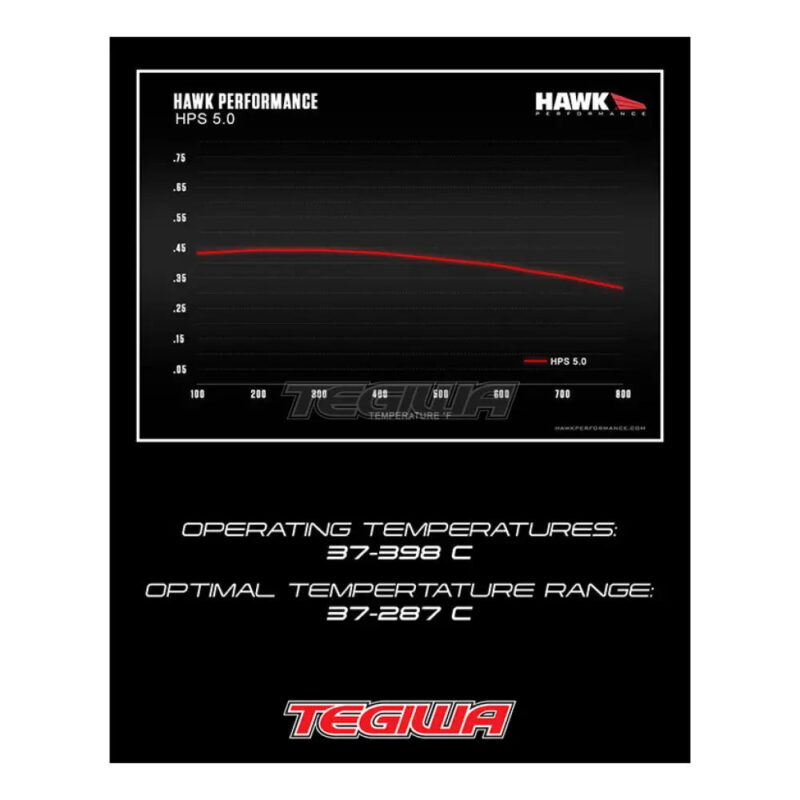 The Hawk HPS 5.0 is a good choice if you are looking to increase your street performance to the maximum level possible without suffering the adverse side effects of noise and large amounts of brake dust commonly associated with higher performance pads. The HPS 5.0 will provide increased brake torque and operating temperature when compared to the Hawk HPS compound. The HPS 5.0 compound can withstand light track use as long as you are aware of the signs of over-heating and allow proper cool off time when the pads approach their upper temperature. The Hawk HPS 5.0 compound is not a race compound and it can not withstand prolonged race sessions at high temperatures. The HPS 5.0 Compound will be cleaner than most OEM Pads, but produce more brake dust than the Hawk Ceramic and Hawk HPS.