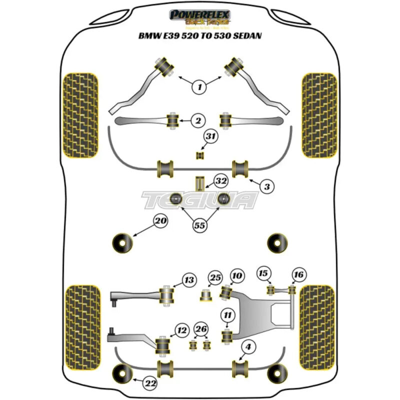 Powerflex Front Anti Roll Bar Bush 25mm BMW 5 Series E39 520 to 530 96-04OEM Part No: 31356770003, 31352229421, 31351096365Diagram Reference: 3Bush Size: 25mmPack Size: 2