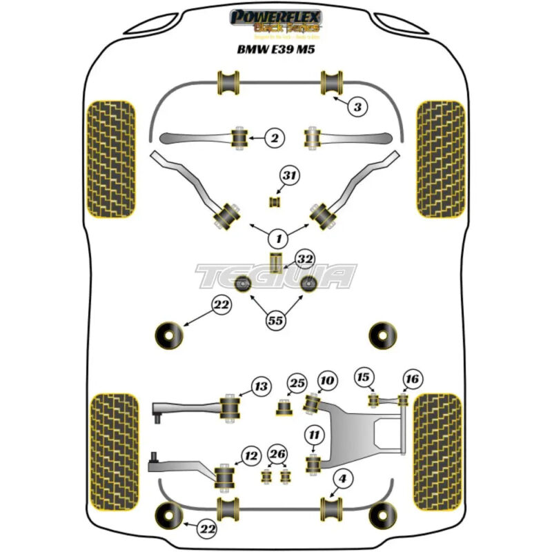 Powerflex Rear Lower Arm Rear Bush BMW 5 Series E39 M5 96-04OEM Part No: Arm = 33326770743 / 33 32 6 770 743 / 33326770744 / 33 32 6 770 744, Arm = 33326754557 / 33 32 6 754 557 / 33326754558 / 33 32 6 754 558Diagram Reference: 11Bush Size: 14mm Bore SleevePack Size: 2