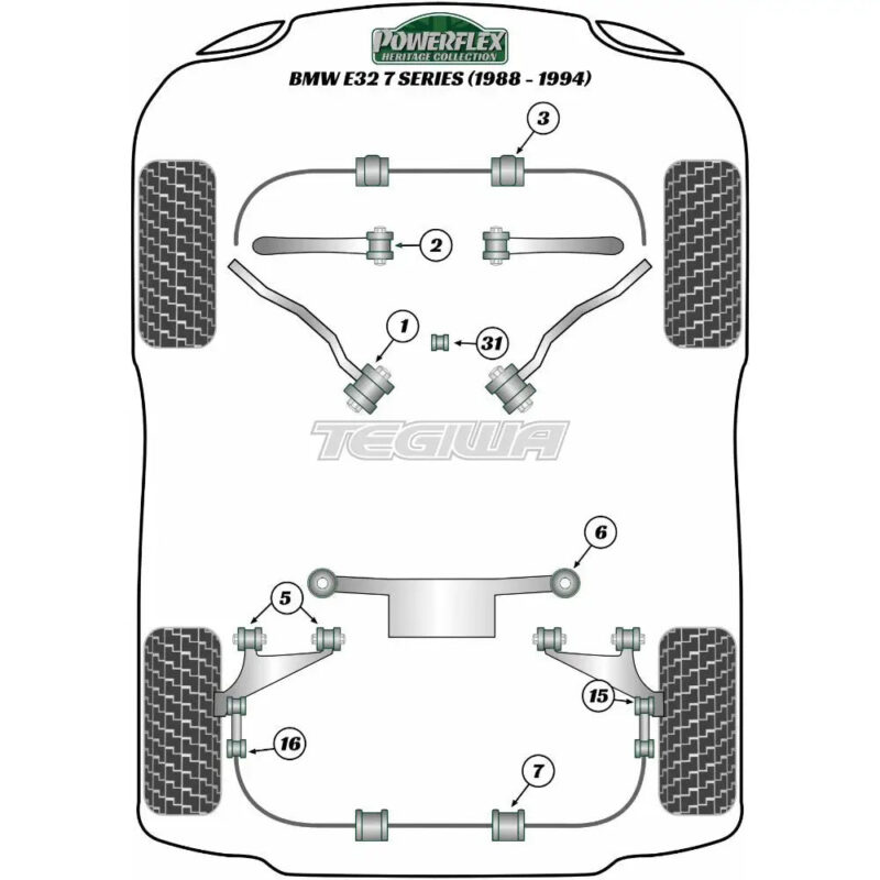 Powerflex Front Anti Roll Bar Mounting Bush 25mm BMW 7 Series E32 88-94PFF5-310-25H fits the E28 M5 from 10/1986 and E24 M635i up to 10/1986. Please check the anti-roll bar diameter before ordering. OEM Part No: Bush = 31351136068 / 31352226334, Bush = 31352225885 / 31352226001, Bar = 31352225886 (E28/E24)Diagram Reference: 3Bush Size: 25mmPack Size: 2