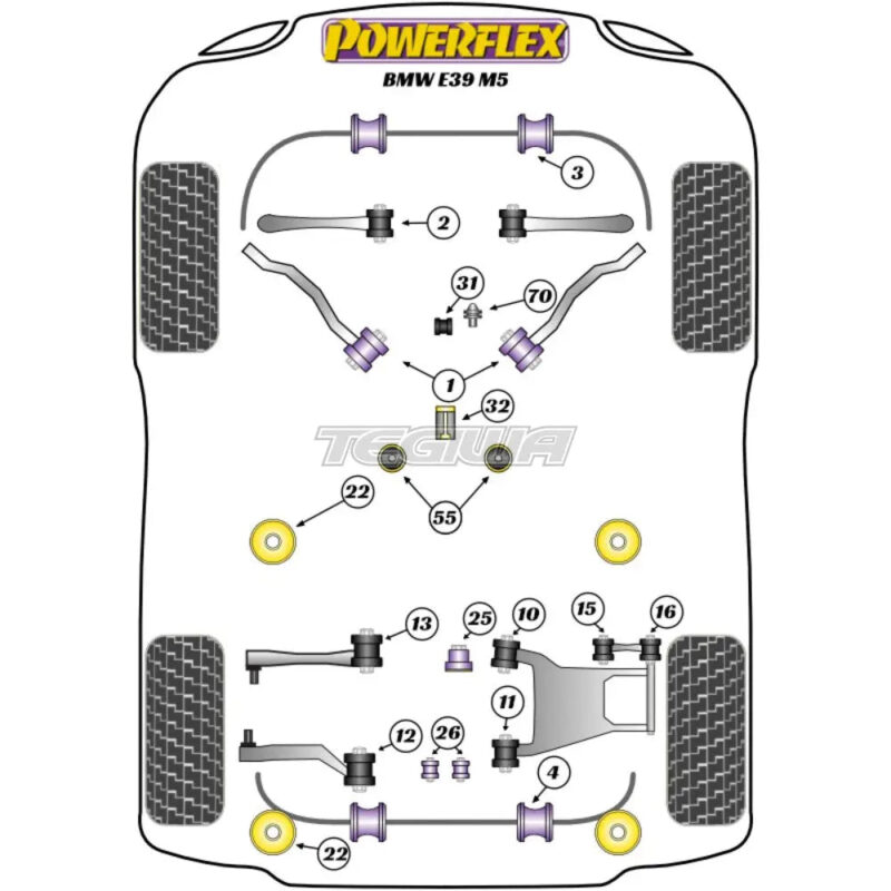 Powerflex Jack Pad Adaptor BMW 5 Series E39 M5 96-04PF5-4660 is a polyurethane jack pad to fit into the plastic lifting points found on most modern BMW and related vehicles and is designed to help lift stability and location, whilst protecting the underside of your vehicle. Fits the following vehicles: BMW 1 Series E81, E87, E88 (2004 – 2013) BMW 1 M E82 (2010 – 2012) BMW 1 Series F20, F21 (2011 – 2019) BMW 1 Series F40 (2018 on) BMW 1 Series F52 (2017 on) BMW 2 Series F22, F23 (2013 – 2020) BMW 2 Series Gran Coupe F44 (2019 on) BMW 2 Series Active Tourer F45, F46 (2014 – 2019) BMW M2 F87 (2015 on) BMW 3 Series E46 (1999 – 2006) BMW 3 Series E90, E91, E92, E93 (2005 – 2013) BMW 3 Series F30, F31, F34 (2011 – 2018) BMW M3 F80 (2011 – 2018) BMW 3 Series G20, G21, G28 (2018 on) BMW M3 G80 (2018 on) BMW 4 Series F32, F33, F36 (2013 – 2021) BMW M4 F82, F83 (2013 – 2021) BMW 4 Series G22, G23 (2020 on) BMW M4 G82, G83 (2020 on) BMW 5 Series E39 (1996 – 2004) BMW 5 Series E60, E61 (2003 – 2010) BMW 5 Series Gran Turismo F07 (2009 – 2016) BMW 5 Series F10, F11 (2010 – 2016) BMW 5 Series G30, G31 (2016 on) BMW M5 F90 (2017 on) BMW 6 Series E63, E64 (2003 – 2010) BMW 6 Series F06, F12, F13 (2011 – 2018) BMW 6 Series Gran Turismo G32 (2017 on) BMW 7 Series E38 (1994 – 2002) BMW 7 Series E65, E66, E67 (2001 – 2008) BMW 7 Series F01, F02, F03, F04 (2007 – 2016) BMW 7 Series G11, G12 (2015 on) BMW M8 F91, F92, F93 (2019 on) BMW 8 Series G14, G15, G16 (2018 on) BMW X1 E84 (2008 – 2015) BMW X1 F48 (2016 on) BMW X2 F39 (2017 on) BMW X3 E83 (2003 – 2010) BMW X3 F25 (2009 – 2017) BMW X3 F97, G01 (2017 on) BMW iX3 G08 (2020 on) BMW X4 F26 (2013 – 2018) BMW X4 F98, G02 (2018 on) BMW X5 E53 (1999 – 2006) BMW X5 E70 (2006 – 2013) BMW X5 F15, F85 (2013 – 2019)BMW X5 F85 M (2013 – 1018) BMW X5 F95, G05 (2018 on) BMW X6 E71, E72 (2007 – 2014) BMW X6 F16, F86 (2015 – 2019) BMW X6 F96, G06 (2019 on) BMW X7 G07 (2018 on) BMW Z4 E85, E86 (2003 – 2009) BMW Z4 E89 (2009 – 2018) BMW Z4 G29 (2018 on) Mini Hatch R50, R53 (2000 – 2006) Mini Hatch R56 (2006 – 2013) Mini Hatch F55, F56 (2014 on) Mini Cabriolet R52 (2000 – 2006) Mini Cabriolet R57 (2006 – 2013) Mini Cabriolet F57 (2014 on) Mini Clubman R55 (207 – 2014) Mini Clubman F54 (2015 on) Mini Countryman F60 (2017 on) Mini Coupe R58 (2011 – 2015) Mini Roadster R59 (2012 – 2015) Rolls Royce Ghost RR4 (2008 – 2018) Rolls Royce Phantom RR1 (2003 – 2017) Rolls Royce Phantom RR11, RR12 (2017 on) Rolls Royce Wraith RR5 (2012 – 2018) Rolls Royce Dawn RR6 (2015 – 2018) Rolls Royce Cullinan RR31 (2017 on) Toyota Supra MK5 J29 (2019 on) OEM Part No: 51717039760 / 51717123311 / 51718268885, 51717169981 / 51717065919 / 51717001650, 51717189259 / 51717164761Bush Size: 80mm DiameterPack Size: 1