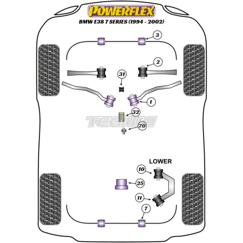 Powerflex Rear Diff Front Mounting Bush BMW 7 Series E38 94-02This part fits against a flat casting face of the diff. If the casing has a spigot use PFR5-525. This part is fitted to the M5 as well as other models. Check OE part number. Fitting InstructionsOEM Part No: Bush 33171090389 / 33171090099, Fits Diff 33107504997 / 33101428736 / 33102229566, Fits Diff 33102228916 / 33101428576 / 33101428521 / 33101214225 / 33101428572Diagram Reference: 25Bush Size: N/APack Size: 1