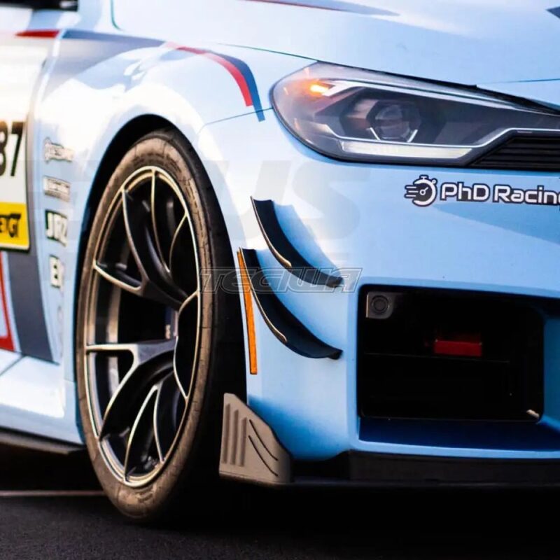 The Verus Engineering Dive Plane (Canard) Kit adds front-end downforce without the necessity of moving the front splitter further forward. Dive planes, when designed properly, improve downforce on the units themselves as well as improving wheel well evacuation which is what we focus on in our development. By manipulating the flow around the vehicle, we are able to improve vehicle performance.